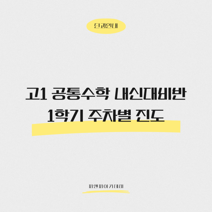 안녕하세요. 피앤피아카데미입니다 오늘은 고1 공통수학 1학기 내신대비반 주차별 진도표를 공유해드리려고 합니다. 고1 공통수학1 내신대비반 고1 학생들을 위한 공통수학1 내신대비반이 개설됩니다. 수업은 주2시간씩 3회 진행됩니다. (월,화,목 진행 + 토요일 오전 질의응답시간 별도 진행) 수강대상으로는 중위권 학생 즉, 공통수학1 기본개념정도는 선행이 된 학생들을 모집합니다. [개념원리 문제집의 필수예재, 확인체크 문제는 풀수 있는 학생] 소수 맞춤 정예 학원인만큼 모집인원은 2명입니다. 특정 한 과목만 부족한 학생들에게 필요한 단과학습 방학때나 특정 기간에 짧게 열리는 특강 평소 자기주도학습이 안되어 있고 전과목 다 부....... <img src="https://blogthumb.pstatic.net/MjAyNjAzMDRfMjQ4/MDAxNzcyNjA2NDg3NTIx.MoplqWRKRnaWB5fNhu3V3UO882_mbYXFGfSVrv4UJOcg.1VhR68CynSNcb_ySQuVLFNQFrO-h48EJcoMrJdYZbAgg.PNG/�젣紐⑹쓣-�엯�젰�빐二쇱꽭�슂_-001_(2).png?type=s3" />