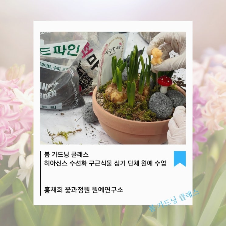 봄 가드닝 클래스 | 히아신스 수선화 구근식물 심기 단체 원예 수업 #봄가드닝 #봄가드닝클래스 #히아신스심기 #수선화심기 #구근식물심기 #단체원예수업 #플라워클래스 날씨가 제법 포근해지며 완연한 봄기운이 느껴집니다. 계절의 변화를 조금 더 빨리, 생생하게 느끼고 싶을 때 함께하기 좋은 활동이 바로 가드닝입니다. 복지관, 병원, 학교, 기업 등 다양한 기관의 참여자분들과 함께 봄을 맞이하는 단체 원예 수업을 진행하고 있습니다. 최근에는 봄의 전령사라 불리는 '히아신스'와 '수선화'를 직접 심어보는 구근식물 가드닝 클래스를 진행했습니다. 기다림마저 즐거운 구근식물 꽃은 활짝 핀 순간도 아름답지만, 흙....... <img src="https://blogthumb.pstatic.net/MjAyNjAzMDVfNDgg/MDAxNzcyNzAwNTgwMDkx.Fdlnr9YLrL1gsg4y3lgOX3snjYGZtWbkKpqy-0wzObwg.SyryYzpFpPWiFOa7Hi3qq53E6lOLV7BAYWCQeURy1nQg.JPEG/%BA%BD_%B0%A1%B5%E5%B4%D7_%C5%AC%B7%A1%BD%BA__%C8%F7%BE%C6%BD%C5%BD%BA_%BC%F6%BC%B1%C8%AD_%B1%B8%B1%D9%BD%C4%B9%B0_%BD%C9%B1%E2_%B4%DC%C3%BC_%BF%F8%BF%B9_%BC%F6%BE%F7.jpg?type=s3" />