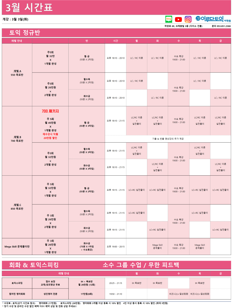 2026년 3월 경산토익학원 이루다토익어학원 토익스피킹 토익 영어회화(원어민) 수업 시간표 및 토익수강료