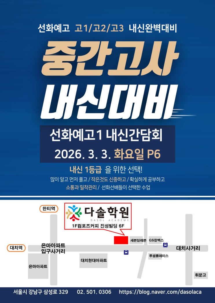 선화예고1 내신대비 간담회 3/3(화)P6 다솔학원 상담전화 02 501 0306 <img src="https://blogthumb.pstatic.net/MjAyNjAyMjFfNzEg/MDAxNzcxNjU4MDY3MDAx.QfaO_tfBjOgdkLgxpPi3CRqK6d-3VuIs3xZIONzmAJMg.o_SuYGWS4FyaGfZbl-PlNYLCp9ki1GJAUHj3H56AD7cg.JPEG/%BC%B1%C8%AD%BF%B9%B0%ED%C0%FC%B4%DC%C1%F6_%281%29.jpg?type=s3" />
