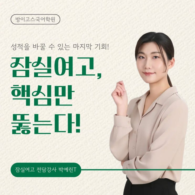 안녕하세요. 고스에듀 방이캠퍼스 방이고스국어학원입니다. 오늘은 잠실여고 학생들을 위해 준비한, 잠실여고 담당 박예린 선생님의 '잠실여고 맞춤형 수업 소개 및 수업 시간'을 안내드립니다. 박예린T의 수업은? 박예린T 수업: 이토록 효과적인 수업 <도식화된 판서> 수업의 흐름이 한눈에 파악되는 예린T만의 차원이 다른 도식화된 판서로 핵심 개념 완벽 정리! <끝없는 질문> 선생님의 설명뿐인 일방적인 강의가 아닌, 학생들이 스스로 생각하고 질문하는, 능동적으로 참여하는 수업으로 진행되는 질문 기반 참여형 수업 <핵심만 쏙쏙> 개념의 중요도를 강사가 모두 선별해 내신 빈출 & 핵심 요소만을 담은....... <img src="https://blogthumb.pstatic.net/MjAyNjAyMjNfMjc0/MDAxNzcxNzcyNTU1Mjk5._QUW55-KsYDXhnuebvpjI_B2N70VtOFANVVfDBbOdbYg.ZWufjpenZDDoWst9oMld1mhldRKOaR_Ra_tdtsYN0mMg.JPEG/1.jpg?type=s3" />