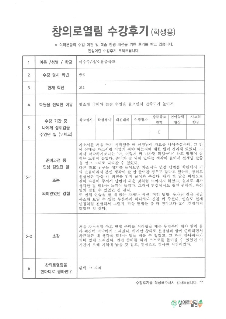 깊이가 다른 논술국어학원 창의로열림입니다 오늘은 올 해 오륜중을 졸업하는 졸업생 이승O 양의 수강후기를 올려드리겠습니다. 창의로는 평소에 국어와 논술수업을 들으면서 만족도가 좋다는 얘기를 많이 들어서 선택했다. 자소서를 처음 쓰기 시작했을 때 선생님이 자료를 내 주셨는데, 그 안에 선배들 자소서랑 어떻게 써야 하는지에 대한 팁이 정리되 있었다. 그래서 막막하기 보다는 "아, 이렇게 써 나가면 되겠구나"하고 방향이 잡히는 느낌이 들었다. 준비가 잘 되어있다는 생각이 들어서 선생님 말씀을 믿고 그대로 따라갈 수 있었다. 다른 학교 친구들 얘기를 들어보면 자소서나 면접 답면을 학원에서 거의 만들어줘서 본인 생....... <img src="https://blogthumb.pstatic.net/MjAyNjAyMTJfMTI4/MDAxNzcwODgwOTY4OTI1.NKaRPaQTi73_htsdPEMOgHq1cFp_kTUCQgp_sM-3jegg.dngm9Lk4s-pNlKi_rrBiyN164QYR4ns9n-I6oB8lqzUg.JPEG/%BC%F6%B0%A1%C8%C4%B1%E2-%C0%CC%BD%C2%C1%D6.jpg?type=s3" />