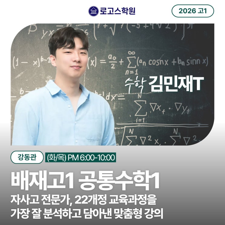 안녕하세요, 로고스학원 입니다. 2026년 144기 배재고 신입생, 1학년을 위한 배재고 수학 수업이 개설되어 안내합니다. 자사고 수학의 절대적 기준! 배재고 공통수학1 수업을 담당하는 수학 김민재 선생님의 수업이 로고스학원 강동관에서 개강합니다! 22개정 교육과정 완벽 분석! 다가오는 3월에 새롭게 개강 되는 김민재 선생님과 강좌에 대해 자세히 안내해드리겠습니다. 2026 1학기 중간고사 대비반 배재고1 공통수학1 수학 김민재T 소개 로고스학원에서는 배재고 수학을 가르치고 북일고, 이전에는 중앙고, BIG 5 전사고 대비반까지 검증된 자사고 전문가인 김민재 선생님! 배재고 수학 수업 안내 & 관리 프로그램 ATTAQUE 학교 부교재....... <img src="https://blogthumb.pstatic.net/MjAyNjAyMTJfOTMg/MDAxNzcwODgwMDcyNzI5.5JNOojmwCxtCF99iXiMps5dgGZ_RWo6mhklFSGAZ2Hkg.pRzUu90jLuWaeDG-VgA2FNHWdrIw6WbA7dNzyFmK7JMg.JPEG/%B9%E8%C0%E7%B0%ED_%BC%F6%C7%D0_%B7%CE%B0%ED%BD%BA%C7%D0%BF%F8_%B1%E8%B9%CE%C0%E7T1.jpg?type=s3" />