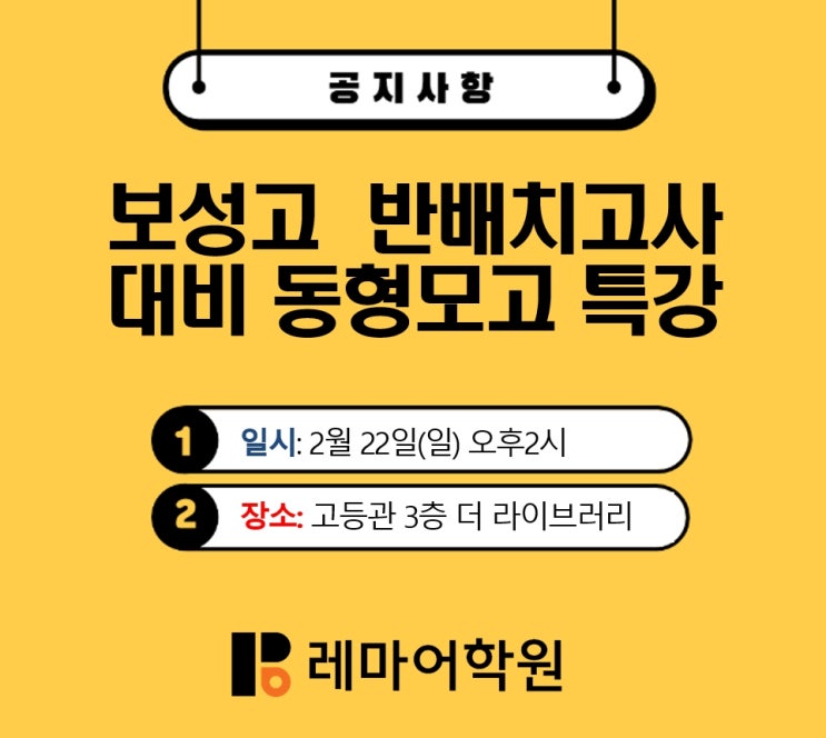 보성고 신입생 반배치고사 특강 희망자는 아래 네이버폼 신청링크에서 신청바랍니다. 안녕하세요. 레마어학원입니다. 26보성고 신입생 반배치고사대비 특강안내입니다. 본수업은 보성고전담 조준영원장 직강으로 진행합니다. *대상: 보성고 신입생 *일시: 2월 22일(일) 오후02시~03시30분 (90분) *내용: 보성고영어 유형변형 실전 모의평가 연습/ 해설강의 *별도의 복습영상은 제공되지 않습니다. 시험의 경중없이 무조건 가치를 두고 최선을 다합니다. 기타문의는 원으로 연락주시면 안내해드리겠습니다. <img src="https://blogthumb.pstatic.net/MjAyNjAyMTNfMjk2/MDAxNzcwOTc3ODE1MzUw.amdZ1u_TUQTmor9xo5Fa-J4W07yofSVs18NnnyD2Z10g.8cq_HtM709s0TiR44QLakHV3N1KNkIzU3qzNZcUIs2sg.JPEG/26%BA%B8%BC%BA_%B9%DD%B9%E8%C4%A1%B0%ED%BB%E7_%C6%AF%B0%AD%282%BF%F922%C0%CF%BF%C0%C8%C42%BD%C3%29.jpg?type=s3" />