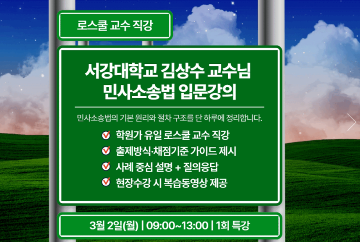 [현장수강 이벤트] 복습동영상 제공 1. 일시 및 장소 - 3월 2일(월) - 1회(월) - 09:00~13:00 - 장소 : 본관 2. 교재 - 자체교안 3. 수강대상 - 변리사 63회 2차 시험을 민사소송법 준비하는 수험생 - 민사소송법을 처음 접하는 수험생 - 민사소송법에 대한 개념을 잡고 싶은 수험생 4. 강의소개 [학원가유일의 로스쿨교수님 직강] - 민사소송법에 대한 기분 원리와 절치, 주요 판례 분석 - 민사소송법 과목의 출제방식와 채점기준에 대한 가이드라인 제시. - 민사소송법 기본원리 및 절차를 정리하여 2차 시험 고득점을 위한 발판을 마련함 법학을 처음 접하는 학생부터 심화 학습을 원하는 수강생까지 모두에게 적합합니다. 실제 사례 중심의 설....... <img src="https://blogthumb.pstatic.net/MjAyNjAyMjRfNjIg/MDAxNzcxODk0MzI2Mzk0.aUO-8eb7kIrH0HeAz2nb10y5HzveOdgPrK_lsGW3s2Ag.dT93rqh3dZXglO107G_kHIlLZpteb-KOkSCoVkjsT3Qg.PNG/image.png?type=s3" />
