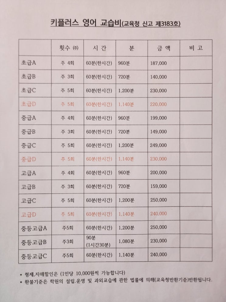 키플러스영어학원 교습비 안내(2026년 3월1일부터)