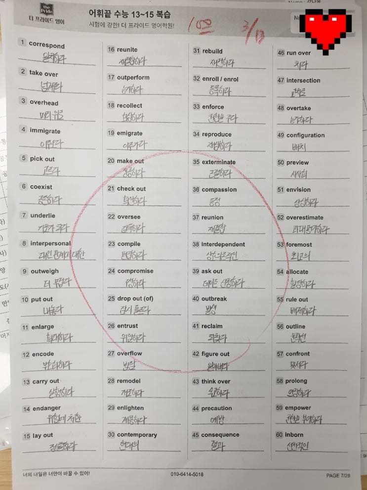 매시간 단어학습 및 test, 문법개념 구두체킹, 오답구두체킹, 구문test & 구두체킹, 독해노트 쓰기 등 2시간이 바쁘게 돌아갑니다~^^ 문법만 잘한다고 영어를 잘하게 되는게 아닌, 단어와 독해와의 균형을 맞춰줘야 영어실력이 오르기에, 오늘도 학생들에게 영어의 육각형을 만들어주기위해 불철주야 고군분투중입니다.^^ 영어를 즐겁게~! 가랑비에 옷젖듯이~! 더 프라이드 영어 010-6414-5018 #화명동영어학원 #화명동 영어학원 #화명 영어 학원 #더 프라이드 영어 학원 #화명동 고등 영어 #화명동 중등 영어 #화명동 초등 영어 #육각형 만들기 #독서노트 <img src="https://blogthumb.pstatic.net/MjAyNjAzMTRfMTAz/MDAxNzczNDUzMzAyMDE0.wlCGRIptpnp6Jr0Toyr7ED8nilbpVXHr_QGhL5WM8I8g.5aviDurwxr12S6l1315Ws4dneWANj7Nbghv3ueS2jwkg.JPEG/900%A3%DF20260314%A3%DF104659.jpg?type=s3" />