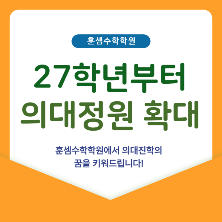 안녕하세요, 훈셈수학학원입니다. 명절 연휴를 보내고 있는 많은 학부모님들에게 인사를 드립니다! 새 학기 준비로 분주한 2월, 교육계에 중요한 변화의 소식이 들려왔습니다. 바로 정부의 의대 정원 확대 발표입니다. 이 정책은 의사를 꿈꾸는 우리 학생들에게 새로운 가능성을 열어주지만, 그만큼 전략적인 준비가 필요한 시점이기도 합니다. 오늘은 의대정원확대 정책의 핵심 내용과 함께 효과적인 입시 대비 방법을 구체적으로 알려드리겠습니다. 보건복지부는 2027학년도부터 의대 모집 인원을 단계적으로 늘리는 계획을 최종 확정했습니다. 2027학년도에는 기존 3058명에서 490명이 추가된 3548명을 모집하고, 2028학년도와 2029학년도에는....... <img src="https://blogthumb.pstatic.net/MjAyNjAyMTZfMjI4/MDAxNzcxMjAxOTgxMzMz.x33MjUQHZH6Vs8C66L2cKUzxTI9aiy8Mp3DZnWi9MsQg._DL8mUr7oyqXezwWiaUrY2nYDy-1eFrev5KEs96koGwg.PNG/27%C7%D0%B3%E2%C0%C7%B4%EB%C1%A4%BF%F8%C8%AE%B4%EB-002_%281%29.png?type=s3" />