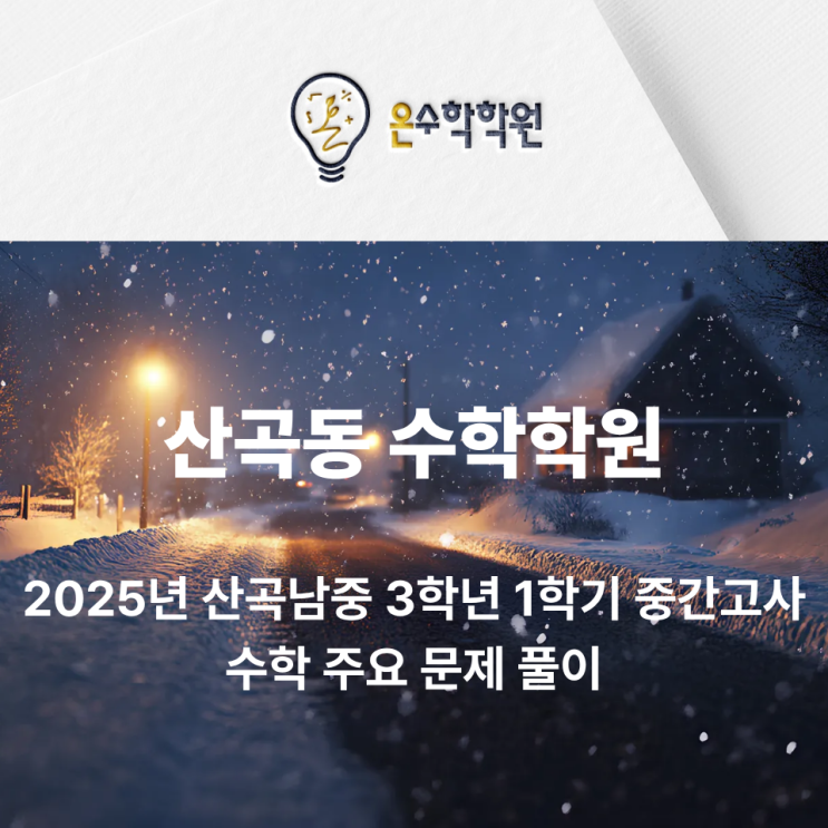 산곡동 수학의 '결정적 차이'를 만듭니다. #부평수학전문 #산곡동수학전문 #온수학학원 네이버 지도에서 온수학학원 검색 후 저장하시면 찾아오기 편합니다. 안녕하세요. 부평구 산곡동 수학 전문 온수학학원입니다. 중, 고등학교 개학이 다가오면서 학생들뿐만 아니라 학부모님들께서도 자연스럽게 학교 시험에 대한 관심이 높아지고 있습니다. 저 역시 학생들의 성적 향상에 도움이 되고자 근처 중학교, 고등학교 기출문제를 직접 풀어보며 시험에 출제되는 문제 유형을 정리하고 있습니다. 오늘은 그중에서 실제 점수에 직접적인 영향을 주는 주요 문제 몇 개를 선정해 간단히 풀이를 정리해 보려고 합니다. 2025년 산곡남중 3학년....... <img src="https://blogthumb.pstatic.net/MjAyNjAyMDlfOCAg/MDAxNzcwNTY4MDk4Njgy._ecpui6VVhwKvR0m9BUNg_4mHcvlV_QJcY4ybvV2-xMg.czICWPYkgXgu3Pz5qN7vhtoWKaAA3xEbl4AB-LzOszwg.PNG/%BA%ED%B7%CE%B1%D7_%281%29.png?type=s3" />