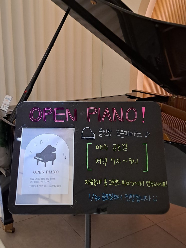 안녕하세요 :) 위피 울산 삼산점입니다! 다음주 1/30 금요일부터 울산 남구 성인 피아노 학원 위드피아레트 울산점에서 오픈 피아노 이벤트가 진행됩니다✨ 매주 금요일 저녁 7시~9시 울산 남구 성인 피아노 학원 위드피아레트 울산점 홀 그랜드피아노에서 자유롭게 연주해 볼 수 있는 이벤트인데요, 평소 쉽게 접하기 힘든 그랜드피아노에서 자유 연주, 연주 감상까지 가능합니다!☺️ 부담 없이 오셔서 편하게 연주하고 음악을 즐겨보세요! 울산 삼산점 위드피아레트는 항상 열려있으니, 피아노 취미를 즐기고 싶은분들은 언제든지 방문해 주세요~! #울산위드피아레트 #울산취미생활 #울산성인피아노 #울산성인미술 #위드....... <img src="https://blogthumb.pstatic.net/MjAyNjAxMjJfOTgg/MDAxNzY5MDgwMjU1Njgy.bJdlgSIw1ZrmC_5opIDfgXTv0qvzC0q-v683-CrzIwog.sTv95ARSysxwxJDRzC6y5vZkQLeq6KLBMni-cF9Pp4kg.JPEG/20260122_191836.jpg?type=s3" />