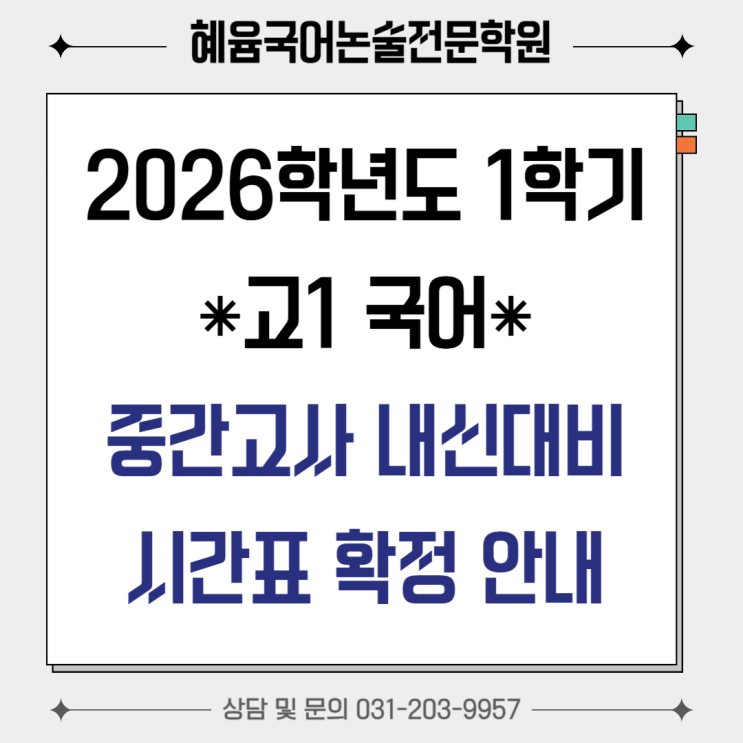 안녕하세요. 혜윰국어논술전문학원입니다! 2026년도 1학기 고1 국어 학교별 내신대비 시간표가 확정되었습니다. 혜윰 국어 중간고사 내신대비는 3월 14일(토요일)부터 시작됩니다! 혜윰에서는 '학교별 전담 강사제'를 통해 각 학교별 '맞춤형 최적화 수업'을 지향합니다. 22개정 교과서? 걱정하실 필요 없습니다. 혜윰만의 노하우가 담긴 자체 제작 교재로 개정된 교과서도 꼼꼼한 내신대비가 가능합니다. 기타 사항은 학원으로 유선 문의해 주시면 자세히 답변해 드리겠습니다! 감사합니다:) 상담/문의: 031-203-9957 <img src="https://blogthumb.pstatic.net/MjAyNjAyMjZfMTk4/MDAxNzcyMDkzNjI2NTMz.WbVvLBr4ukqvf3sgZQr3pymsIb5gtb4qsGcA_j13o0sg.npng8UrFehdgTrWbUHo4gfEYIuVY22SNjYNAH0FHye4g.PNG/%C1%A6%B8%F1%C0%BB_%C0%D4%B7%C2%C7%D8%C1%D6%BC%BC%BF%E4_-001.png?type=s3" />