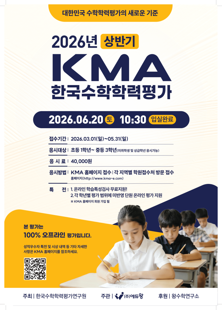 안녕하세요, MTS입니다~ 오늘은 초등학생부터 중학생까지 현재 수학 실력을 객관적으로 점검해볼 수 있는 2026년 상반기 KMA 한국수학학력평가 소식을 안내드리려고 합니다. 수학은 단순히 문제를 많이 푸는 것만으로는 현재 위치를 정확하게 파악하기 어렵습니다. 지금 우리 아이가 어느 부분에서 강점을 보이고 있는지, 또 어떤 단원을 보완해야 하는지를 확인하려면 공신력 있는 평가를 한 번쯤 경험해보는 것이 큰 도움이 됩니다. 이번 2026년 상반기 KMA 한국수학학력평가는 초등 1학년부터 중등 3학년까지 응시할 수 있는 수학 학력평가로, 학생의 현재 수학 실력을 객관적으로 확인하고 앞으로의 학습 방향을 설정하는 데 도움이 되는 시....... <img src="https://blogthumb.pstatic.net/MjAyNjAzMDlfNzUg/MDAxNzczMDQ3NTE1NDE2._xHAv0NALN0hzxDgCJP6hxJfnHPNivC_hEcQ46xBBGYg.bSSwYaNUbuPEIbV1nsE9I6yONjSR_H_XYZm8AhGUt44g.PNG/ebeda32b-1.png?type=s3" />