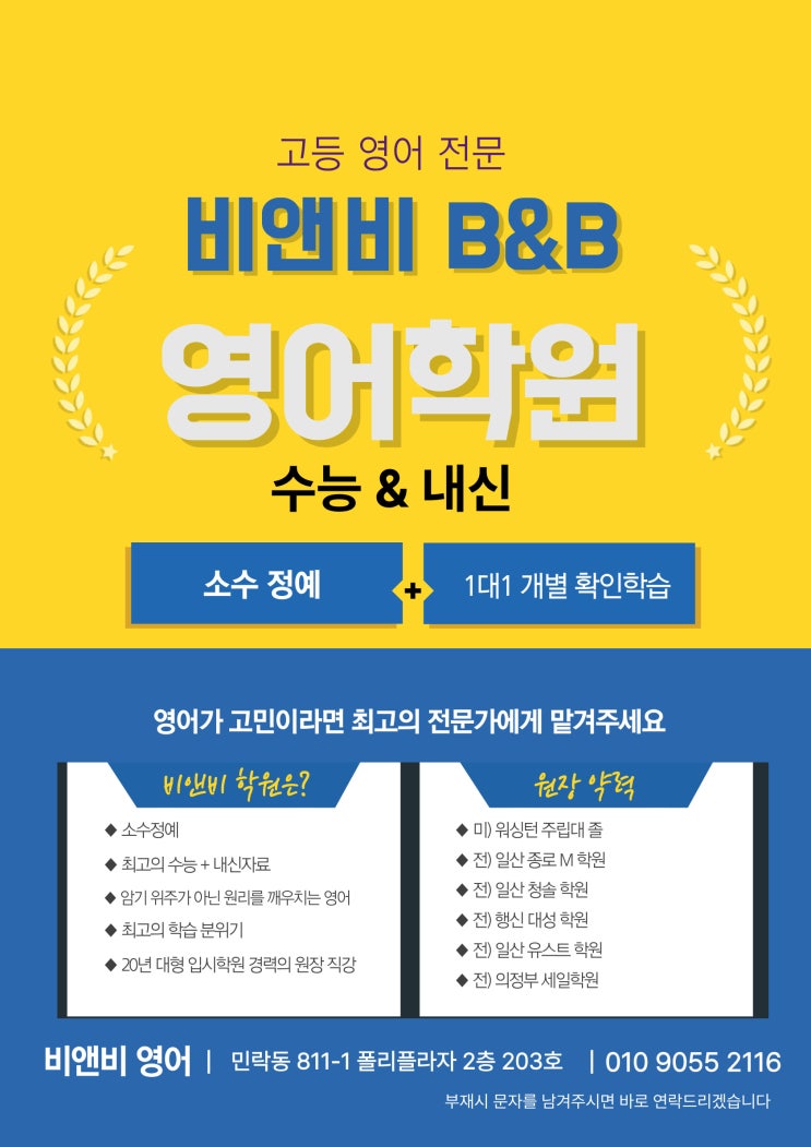 새 학년 새 학기 내신대비를 위한 원생 모집 ▶ 고1 영석고 1 1등급 준비반 : 2명만 추가로 모집합니다 송양, 송현고 원생 모집 ▶ 고2 영석고 2 1등급 준비반 : 1명만 추가로 모집합니다 송양, 송현고 원생 모집 비앤비 영어는? 1 소수 정예 [1 대 1 밀착 관리] 혹시 현재 한 반에 인원이 많은 대형 학원에서의 공부와 교재 또는 커리큘럼이 맞지 않는다면 비앤비가 정답 2 원장 직강 대형 입시학원 20년 경력의 원장 직강 3 막대한 내신, 모의고사, 수능 자료 지문 분석, 변형 문제, 기출문제, 워크북 등 막대한 자료를 필요한 만큼 직접 제본하여 내신대비 기간 학생들에게 무료제공 [재원생들 사이에선 이미 자료 왕국이라 불립니다] 4 최고....... <img src="https://blogthumb.pstatic.net/MjAyNjAyMjNfMjI5/MDAxNzcxODQ1MTkwNDAx.AfBdtCvtJXuoCSA_CjCACwAxYFJHoAJ75OoEN1fuVMcg.b_4nfIzZG6TCqcnfrQtCfkO3lKnCKtWlrUmKStRanDQg.JPEG/26%B3%E2_3%BF%F9_%C0%FC%B4%DC%C1%F6.jpg?type=s3" />