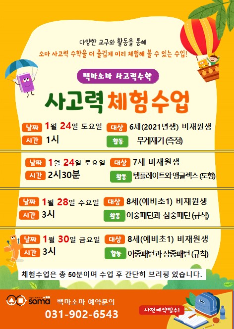 백마소마에서 1월에 소마 사고력 체험수업을 진행합니다. 6세~8세 (예비초1)을 대상으로 아래와 같이 진행할 예정입니다. 체험수업은 총 50분이며 수업 후 간단히 브리핑 있을 예정입니다. 소마 사고력 수학에 대해 평소 궁금하셨거나 우리 아이가 수업 적응을 잘할 수 있을까? 궁금했던 어머님들은 1월 체험 수업 신청해 보세요. 전화나 문자로 신청하시면 됩니다. 031-902-6543 010-2742-9127 (선착순 마감예정) <img src="https://blogthumb.pstatic.net/MjAyNjAxMTBfMTYx/MDAxNzY4MDMxOTAyOTcy.31LNK6ndDFX-giOYdWaMN444Nz8rMsV2jMhy96vcJjkg.dN7Gfc9t7VMBja61EvcFVujZLavDWyxxBJvX59blYGkg.JPEG/%C3%BC%C7%E8%BC%F6%BE%F7%BE%C8%B3%BB_.jpg?type=s3" />