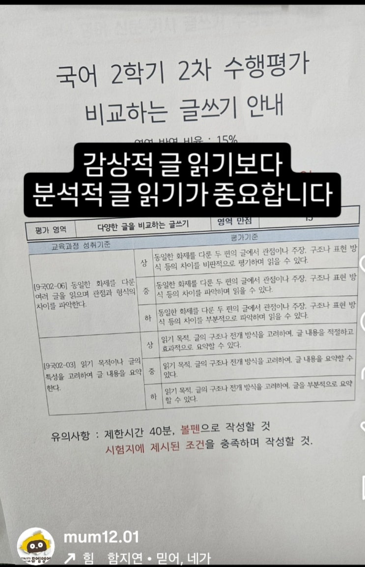 안녕하세요 공부습관을 중요시 하는 학원 뮤엠영어후곡점 입니다 ^^ 오늘은 독서교육의 방향에 대해 이야기 해보겠습니다 우리 초등학생들은 앞으로 겪게될 중고등부를 위해서 공부합니다 그 어느 영역보다 공부는 방향성이 중요합니다 잘못된 방향으로 공부를 할 경우, 귀중한 시간도 소비되고 아이들의 지적인 호기심도 없어집니다 어떤 방향으로 공부해 나가야 할까요 ? 중학교 시험유형 근처 오마 중학교 수행평가를 살펴보겠습니다 국어 수행평가 입니다 동일한 화제를 다룬 글을 읽으며 과점과 형식의 차이를 파악하는 과제입니다 가장 높은 점수는 동일한 화제를 다룬 두편의 글에서 관점이나 주장, 구조나 표현 방식등의 차이를 비판적으....... <img src="https://blogthumb.pstatic.net/MjAyNjAyMDhfNzQg/MDAxNzcwNTI1MjU4NTU4.UQdLU9nWMHyoAkGnIFArFXUdszkpWOvzorCkvPuHnSQg.EnWulbcwrGAqAORhHBG9hs8nlpBunbaBT84tkJd-c4Qg.JPEG/%C6%FA%B8%AE%BF%C0.jpg?type=s3" />