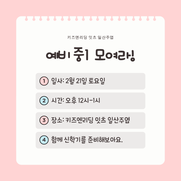안녕하세요.^^ 독서도 잘하고, 입시도 잘하는 한수중 근처 키즈엔리딩 잇츠 일산 주엽점입니다. 이제 기나 긴 겨울 방학이 어느덧 끝나가며 신학기가 다가오고 있습니다. 신학기가 다가오며 아이들보다 오히려 학부모님들의 마음이 더 바빠집니다. 우리 아이가 중학교에 가서도 잘 할 수 있을까? 중학교 공부는 얼마나 어려워질까? 막연한 걱정이 하나둘 생기기 시작하죠. 예비중1은 학년이 바뀌는 시기이기 보다 공부의 방식이 바뀌는 시기입니다. 이 시기에 방향을 어떻게 잡느냐에 따라 앞으로의 학습 흐름이 크게 달라질 수 있습니다. 그래서 저희 원에서는 신학기를 맞아 예비중1 학생들과 OT 시간을 마련했습니다. O.T 에서 다룰 내용 성적....... <img src="https://blogthumb.pstatic.net/MjAyNjAyMTFfMjUz/MDAxNzcwNzk4NzQ0MTQ4.hTYd0lfj5Ot5sL8XYEHSZitBY_d1UUv7HRu-BrrNImwg.mOkZmU9ABOxbe3H2HZsFHxnrF73aYCMoh7f7NxxOp-Ag.PNG/%C1%DF1_ot.png?type=s3" />