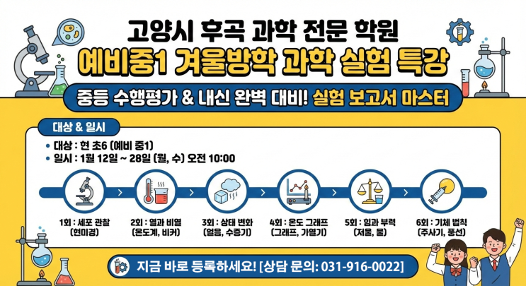 [일산 후곡 과학 특강] 예비중1, 실험으로 잡는 중등 과학 수행평가 & 내신 완벽 대비! 안녕하세요, 일산 후곡 과학 전문 학원 윤사이언스입니다. 초등학교를 졸업하고 중학교 입학을 앞둔 지금, 우리 예비 중1 학부모님들의 가장 큰 고민은 무엇인가요? 아마도 "부쩍 어려워진다는 중등 과학, 어떻게 준비해야 할까?"일 것입니다. 중학교 과학은 단순 암기를 넘어, 실험 과정을 이해하고 결과를 논리적으로 서술하는 '수행평가'의 비중이 매우 높습니다. (학교별로 차이가 있지만 보통 40~50% 내외) 윤사이언스에서는 우리 아이들이 중학교 과학을 자신감 있게 시작할 수 있도록, [예비 중1 겨울방학 실험 특강]을 준비....... <img src="https://blogthumb.pstatic.net/MjAyNTEyMjZfMjk1/MDAxNzY2NzU0NzQ1OTQ4.xPoxAedDautI4v9arbiR4LJanpOdm_yoTpYxOcjDO-Qg.y1nOetnq4BkVBABHYqc7G1ngWt9tSfvDNiRwqkGk7uMg.PNG/%C0%B1%BB%E7%C0%CC%BE%F0%BD%BA_%B0%DC%BF%EF%B9%E6%C7%D0%C6%AF%B0%AD_%C1%DF%B5%EE%BD%C7%C7%E8.png?type=s3" />