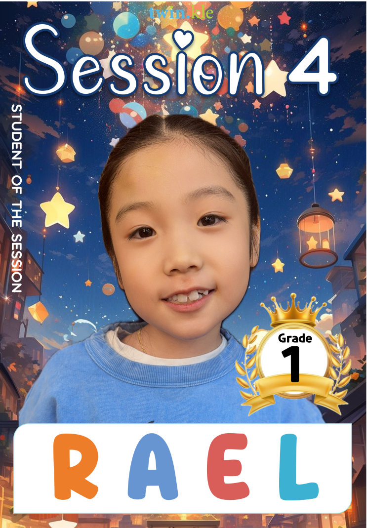 안녕하세요! 트윈클어학원 일산입니다:) 2025년 Session 4를 마무리하며, 한 학기 동안 꾸준한 노력과 성실한 태도로 눈부신 성장을 보여준 아이들을 소개하고자 해요! Student of the Session은 단순히 시험을 잘 본 학생이 아니라, 각 학년에서 한 학기 동안 가장 높은 점수 총합을 기록하며 학습의 과정과 결과 모두에서 뛰어난 모습을 보여준 학생에게 수여되는 의미 있는 선정이랍니다. 이번 Session 4에서도 스스로의 목표를 향해 묵묵히 나아간 아이들이 있어 더욱 뜻깊은 시간이였어요. Session 4에서 멋진 모습을 보여준 아이들은 과연 누구일까요~?? -Grade 1- Rael [Adventurous Birds] -Grade 2- Emily [Colossal Cobras] -Grade 3- ....... <img src="https://blogthumb.pstatic.net/MjAyNjAxMDVfOTIg/MDAxNzY3NjAwNTE5Njk1.PUVT3OAQVoW_-kj8CZq3C7lLFz8lVN9JaiiCs8LvYSQg.P_ycBrEtASFNq4uzxGjCsp9Jjm8pmtC-KB_sCu1rJHIg.PNG/Rael.png?type=s3" />