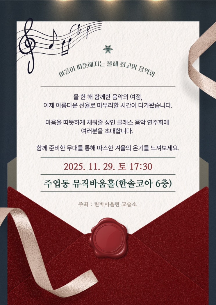 안녕하세요~ 린바이올린 입니다! 정말 오랜만에 블로그에 포스팅을 하는 것 같아요! 1:1로 수업을 진행하다보니 블로그에 자주 들어오기가 쉽지 않은 것 같아요 오늘은! 저희 린바이올린의 성인회원분들과 함께 지난달 11/29일 토요일 뮤직바움홀에서 진행했던 연말콘서트를 보여드리고자 합니다~~ 성인회원분들은 아무래도 본업이 있으시기 때문에 취미를 길게 유지하시기 힘든 경우들이 종종 있으시지만 저희 린바이올린 성인회원분들은 그럼에도 끝까지 포기하지 않으시고 콘서트까지 함께 하셨습니다 작년에도 함께 하셨던 분들이 대부분이여서 서로 응원도 해주시고 서로의 연주를 진심으로 들어주시면서 개개인의 노력을 알아....... <img src="https://blogthumb.pstatic.net/MjAyNTEyMTVfMjkw/MDAxNzY1Nzc1Nzg4NzEx.3McC2I_f1G_hwISV8W3PU6ezyCwqHXW-6klhW9ACAfkg._jAjofM2UOLsiVZG7j5lwYHpF0Dk0bP4oEaaT7PyDoAg.JPEG/IMG%A3%DF6830.JPG?type=s3" />