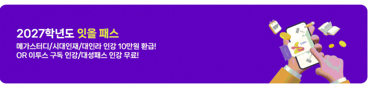 안녕하세요, 잇올 스파르타 김포센터입니다. 오!늘!은! 잇올 재원생이라면, 그리고 3개월 이상 장기 결제자라면 받을 수 있는 혜택인 2027학년도 잇올패스에 대해 소개해 볼까 합니다. 잇올(www.itall.com) 홈페이지에 접속하시면, 콘텐츠 페이지를 확인하실 수 있어요. 콘텐츠 페이지 첫번째 콘텐츠 하이라이트에 접속하시면 잇올패스 혜택을 확인하실 수 있습니다. 잇올패스란 3개월 이상 장기 결제 시 환급패스/무료패스/콘텐츠패스 중 택 1하여 혜택을 제공하는 것을 말합니다. 그 중에서 오늘은 인강패스를 소개하려고 합니다. 10만원을 학습지원금으로 돌려 드립니다. 무료패스는 이투스 구독 인강 / 대성패스 인강 을 장기결제 기간 동안....... <img src="https://blogthumb.pstatic.net/MjAyNTEyMTdfMjg3/MDAxNzY1OTI4MDU3ODYz.bS0LTTeTi44QhdrYaY0kKXXAlilDbYIdk73i3dhNdTkg.3usIuXHU5YxQUQJ6y3RG36W-QeBvn9ZhbUJNj-F7dhAg.GIF/%EB%B8%94%EB%A1%9C%EA%B7%3F_%3F%9E%87%3F%98%AC%3F%8C%A8%3F%8A%A4_%3F%3F%EB%AC%3F.gif?type=s3" />