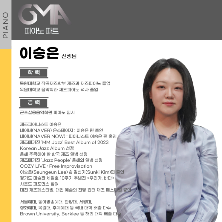 안녕하세요! 군포 최고의 실용음악 기관 군포실용음악학원 입니다 피아노 파트 이승은 선생님을 소개합니다 이승은 선생님 영상 이승은 선생님께서 출연하신 NAVER 온스테이지 무대 영상입니다 이승은 선생님께서 출연하신 NAVER NOW 무대 영상입니다 이승은 선생님의 피아노 수업은 매주 목요일 군포실용음악학원에서 진행됩니다 <img src="https://blogthumb.pstatic.net/MjAyNjAyMjNfMjUg/MDAxNzcxODM2MzcyMzM2.cERCsm6VC7FVploVpc1-qgs-qzvds7b6s5n6ZYfcLIog.ser0gIPboPGbD5zXfv3i1atwhxK3cpbicQSZOVgN7I0g.PNG/%C1%A6%B8%F1%C0%BB-%C0%D4%B7%C2%C7%D8%C1%D6%BC%BC%BF%E4_-020_%281%29.png?type=s3" />