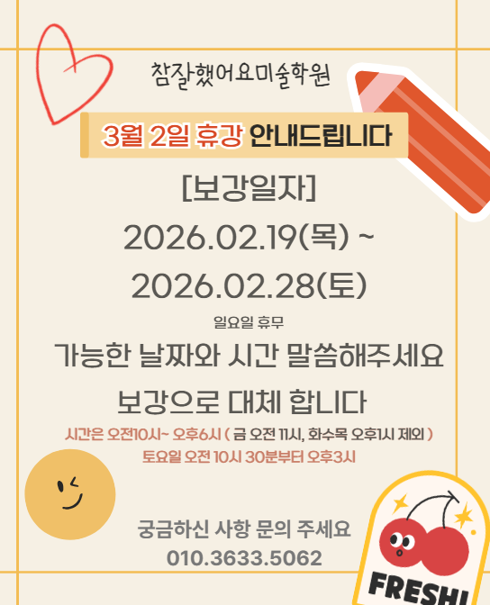 3월 2일 대체공휴일 휴강 및 보강 안녕하세요 항상 보내주시는 관심과 믿음에 감사드립니다. 3월 2일(월)은 대체공휴일로 지정됨에 따라 해당 날짜 수업은 휴강임을 안내드립니다. 수업은 쉬지만, 아이들의 수업 결손이 없도록 아래 일정으로 보강 수업을 진행합니다. 휴강일 ▶ 3월 2일 (월) – 대체공휴일 보강 일정 ▶ 2026.02.19(목) ~ 2026.02.28(토) ▶ 오전10시부터 오후6시까지 (금 오전10시 화수목 오후1시 제외) ▶일요일 휴무 ※ 공지문은 개별 안내드릴 예정입니다. 아이들이 즐겁고 안정적으로 수업을 이어갈 수 있도록 항상 최선을 다하겠습니다. 감사합니다 참잘했어요미술학원 드림 <img src="https://blogthumb.pstatic.net/MjAyNjAyMTlfMjU3/MDAxNzcxNDc0NDU2NjU3.8dPuNevVNy8xvTzIKV6kiwTRn39CR6I-0z3SgFybmTIg.eqLLmExmJFOj625BzbxgEMx22aL_3zAQw-XqGFApDxEg.PNG/KakaoTalk_20260219_124818284.png?type=s3" />