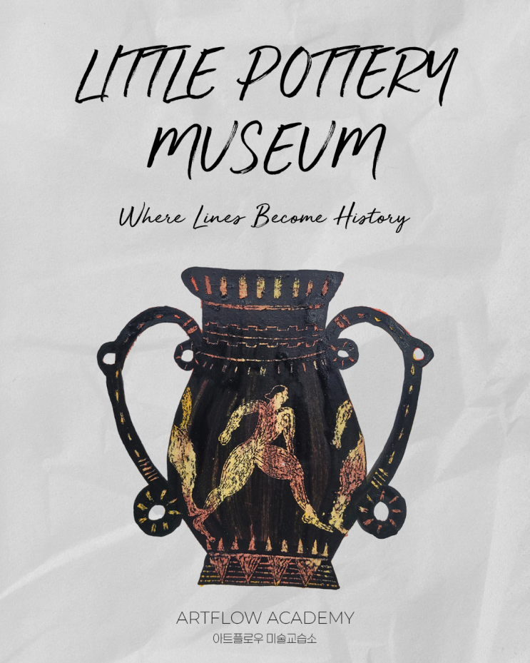 선으로 발견하는 이야기 이번 아트플로우 수업에서는 고대 그리스 토기의 문양을 관찰하고 표현해보는 시간을 가졌습니다. 그리스 토기는 단순한 그릇이 아니라 그 시대 사람들의 생활과 생각이 담긴 ‘기록’에 가깝습니다. 반복되는 패턴, 인물의 움직임, 상징적인 모양들은 글이 없던 시절의 이야기 전달 방식이기도 했습니다. 아이들과 함께 실제 이미지를 살펴보며 “왜 같은 무늬가 반복될까?” “무엇을 표현한 걸까?” 질문을 나누는 것부터 수업이 시작됩니다. 긁어서 그리는 그림, 스크래치 기법 이번 작업은 덮고 → 드러내는 방식의 스크래치 기법으로 진행했습니다. 먼저 화면 전체를 어둡게 덮은 뒤 도구로 천천히 긁어내며 선을 만....... <img src="https://blogthumb.pstatic.net/MjAyNjAyMTlfMzMg/MDAxNzcxNTEwMjU5MTEw.dVdPKDjnybOXgt5-EMQ_pzMh2D-hN4_JDBY1iVCDPAgg.OH9V5EltYrEfzuDC0tsENAhXiqClh3h948j2ZsTmTmAg.PNG/%B1%D7%B8%AE%BD%BA%B5%B5%C0%DA%B1%E2.png?type=s3" />