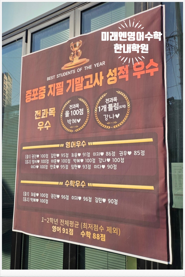 [증포중영어수학] “증포중 기말평가 전과목 100점 배출, 평균 영어 91점·수학 88점의 비결”