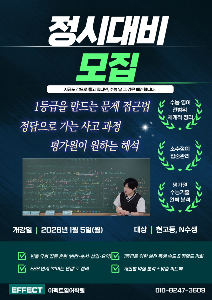 고3 영어 정시대비반 모집 정시는 영어에서 갈립니다. 수능 영어, 감(感)으로 풀던 시대는 끝났습니다. 이제는 출제 원리 + 실전 전략이 성적을 만듭니다. ✔ 수능 영어 전 범위 체계적 정리 ✔ 빈출 유형 집중 훈련 (빈칸·순서·삽입·요약) ✔ 평가원/수능 기출 완벽 분석 ✔ 1등급을 위한 실전 독해 속도 & 정확도 강화 ✔ 개인별 약점 분석 + 맞춤 피드백 고3 정시를 목표로 하는 학생이라면 필수 선택! EBS 연계도, 기출도, 실전도 정시 영어, 이펙트에서 끝냅니다. 대상: 정시로 대학을 바꾸고 싶은 현 고등학생 / N수생 수업: 소수정예 집중 관리 문의 및 상담: 010-8247-3609 지금 준비하지 않으면, 수....... <img src="https://blogthumb.pstatic.net/MjAyNTEyMTRfMTgw/MDAxNzY1NzAyMzU0NjU4.NC51n_LYZp1M57bDLzmW9HkqJNdyTK2A3ZC-NotPX6kg.1VIah_fjazwUCGLLbVaPt7ZAY5pvJmoerGqKs3V_9CYg.PNG/%C1%A4%BD%C3%B4%EB%BA%F1.png?type=s3" />