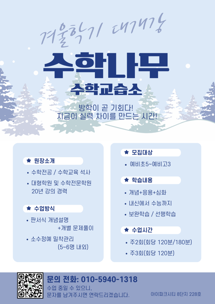 안녕하세요. 수학나무입니다. ^^ 기말고사가 종료된 학생들은 현재 2026학년도 1학기 선행 과정에 이미 들어가 수업을 진행하고 있습니다. 본 수업은 판서식 수업과 개별 문제풀이를 병행하여 진행되며, 진도 차이가 있는 경우에는 개별 진도 조정을 통해 기본을 맞춘 후 정규 수업에 자연스럽게 합류할 수 있도록 지도합니다. 소수 정예로 운영되는 만큼, 학습 관리와 진도 조율이 필요한 학생들에게 적합한 수업입니다. 또한, 방학특강을 통해 보완학습은 물론, 선행학습과 심화학습까지 학생의 수준과 목표에 맞춘 수업이 가능합니다. 방학기간을 효율적으로 활용하고자 하는 분들의 많은 문의 바랍니다. 수업 중일 때가 있으니 상담 및 문의....... <img src="https://blogthumb.pstatic.net/MjAyNTEyMTdfMTg2/MDAxNzY1OTAzNTM1MTk4.thdTyYBXdB83QZtP9CzQ9TEMXxgMeUWfnzUv6V3TwSIg.x89n75ld_k6RggVjUIxOMwc62KJVPa_KizM58qVB0bYg.PNG/3.png?type=s3" />