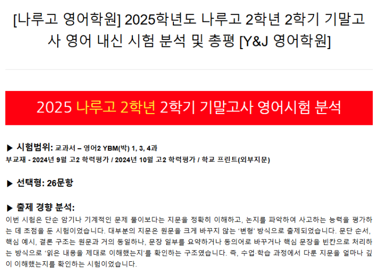 [나루고 영어학원] 2025학년도 나루고 2학년 2학기 기말고사 영어 내신 시험 분석 및 총평 [Y&J 영어학원]