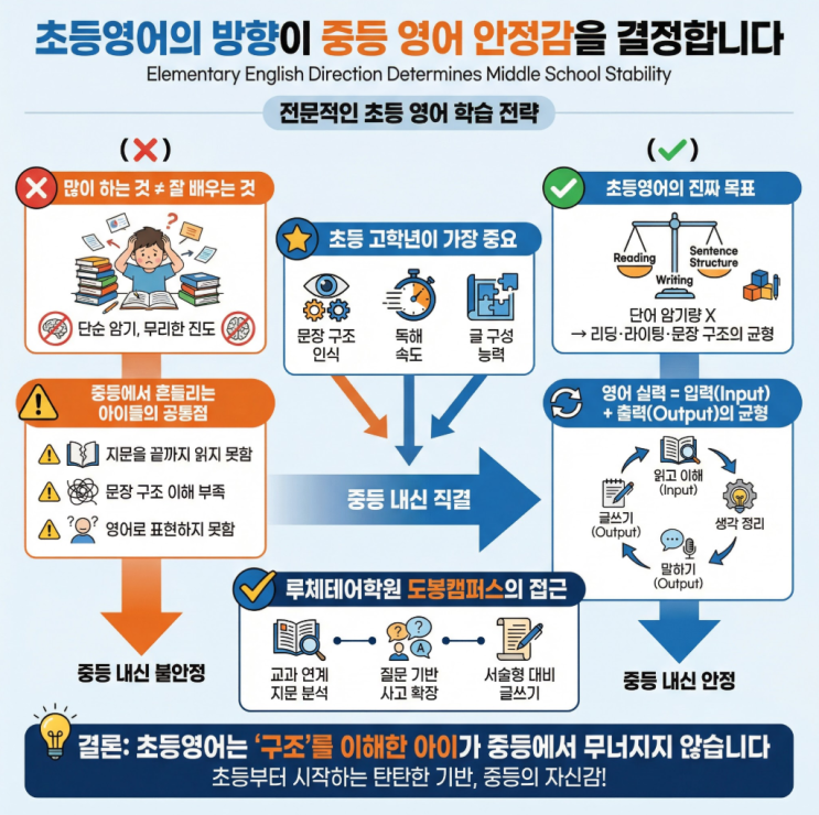 “초등영어는 아직 여유가 있는 시기 아닌가요?” 창동영어학원 상담을 하다 보면 이 질문을 자주 듣습니다. 하지만 실제로 수업을 하다 보면 초등영어에서의 ‘방향 설정’이 중등 영어의 안정감을 좌우한다는 것을 느끼게 됩니다. 많이 하는 것과 잘 배우는 것은 다르기 때문입니다. 초등영어, 무엇을 먼저 점검해야 할까요? 초등영어 단계에서 흔히 강조되는 것은 단어 암기량 문제 풀이 속도 선행 학습 여부 입니다. 하지만 중등에서 흔들리는 아이들을 보면 공통적인 원인이 있습니다. ✔ 지문을 끝까지 읽지 못한다 ✔ 문장의 구조를 이해하지 못한다 ✔ 자신의 생각을 영어로 표현하지 못한다 즉, 리딩·라이팅·문장 구조 이해의 균형....... <img src="https://blogthumb.pstatic.net/MjAyNjAyMTlfMjYz/MDAxNzcxNDU5MzI0MDA5.SDZW-bToDjqqWPITP6SvymXaXVK4F5NGaPS9R16FEE8g.QEGVohaqUYDsJZiMsPRkFMZzf9KAde3aq1UznNYKzh4g.PNG/image.png?type=s3" />