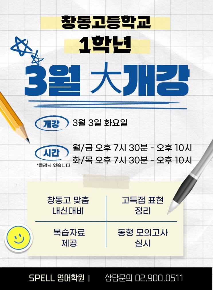 창동고 1학년 창동고 1학년 [월금반] 월요일 오후 7시 30분 - 오후 10시 금요일 오후 7시 30분 - 오후 10시 창동고 1학년 [화목반] 화요일 오후 7시 30분 - 오후 10시 목요일 오후 7시 30분 - 오후 10시 상담문의 02-900-0511 창동고는 역시 SPELL! <img src="https://blogthumb.pstatic.net/MjAyNjAyMjNfMjg2/MDAxNzcxODQ2Nzc3MDE1.6auQw69ltYdY8QNdRlvquqiGjymtkLoMsSLpCJG5-VEg.fBeTEvMJhOD8JH-E8c8khMEdU-zo4Eod5KzRJV10JdQg.JPEG/%C1%A6%B8%F1%C0%BB_%C0%D4%B7%C2%C7%D8%C1%D6%BC%BC%BF%E4._%2813%29.jpg?type=s3" />