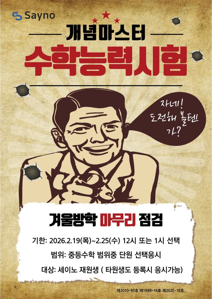 안녕하세요 ^^ 창동 수학학원 세이노학원 중계점입니다. 지난 겨울방학 동안 차곡차곡 쌓아온 공부의 결과를 확인하는 시간, 세이노 개념마스터수학능력시험이 오늘부터 시작되었습니다. 방학이 우리 친구들의 실력을 쌓는 시간이었다면, 개학을 앞두고 제대로 공부했는지 그 내용을 점검하고 다듬는 시간은 분명히 필요하겠죠? 우리 세이노친구들에겐 구멍이 있어서는 안되니까요 ^^ 개념마스터수학능력시험 시간은 2월 19일부터 2월 25일 수요일까지 하루 두번씩 총 10번에 걸쳐 학생이 그동안 공부했던 내용에 대해 제대로 공부되었는지 확인해보는 시간입니다. 원래 세이노는 개별진도식 수업과 함께 정기적인 복습 테스트를 운영하고 있긴합....... <img src="https://blogthumb.pstatic.net/MjAyNjAyMTlfOCAg/MDAxNzcxNDc2NTQ5MTg2.iu5kcWakYP9AY8EopxJWpYFdPT_sn2-QxnVKxe1i-7wg.Rf0Np4pol3w3WqHZjfG5HAusEI1hNl8kbA2fErohuCAg.JPEG/%B0%B3%B3%E4%B8%B6%BD%BA%C5%CD%B4%C9%B7%C2%BD%C3%C7%E8.jpg?type=s3" />