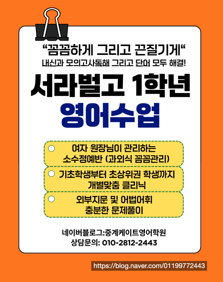 안녕하세요 중계케이트영어학원 원장입니다. 서라벌 고등학교 1학년 학생들을 모집중에 있습니다 (^^) 학원에서 영어실력도 키워주며 내신도 개별적으로 꼼꼼하게 봐주고 있습니다. 26년 서라벌 고1 학생들 교재리스트가 나왔습니다! 영어교과서는 공통영어1 능률(민)입니다. 1학년 영어 부교재는 능률 수능유형 pick 독해 실력 입니다 1학년 영어 단어장은 ybm 부스터보카 수능입니다 학생의 개별실력에 따라 개별플랜을 짜주고 수업이 필요할땐 수업을 과외처럼 개별식 진도가 필요할땐 개별식 진도를 한명한명 맞춰서 진행합니다. 문의 010-2812-2443 학교와 학년을 문자 남겨주시면 확인 후 연락드리겠습니다. 감사합니다 <img src="https://blogthumb.pstatic.net/MjAyNjAzMTFfODEg/MDAxNzczMjMyODAwMTU4.exClHMkbDk-lu6pC5-ZL6SDxd7-Z2bJxjeK1oA0BsPcg.w3CgkKEBfJF3s8rA9fCx5i3rAvcCE_iChl8A6B-oyoYg.PNG/image.png?type=s3" />