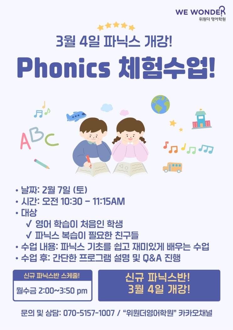 영어 첫걸음을 위한 파닉스 수업이 열립니다! 영어를 처음 시작하는 아이들, 또는 파닉스를 배웠지만 아직 헷갈리는 친구들을 위한 기초 파닉스 체험 수업을 준비했습니다! 영어는 처음 시작이 정말 중요하죠. 단어를 읽지 못하면 자신감도 떨어지고, 영어가 점점 어려운 과목이 되어버리기 쉽습니다. 체험수업에서는 수업에서는 소리와 철자의 관계를 이해하는 활동을 해보며 스스로 읽을 수 있는 힘을 기를 수 있도록 아이들 눈높이에 맞춰 쉽고 재미있게 진행합니다. : ) 수업 안내 날짜: 2월 7일 (토) 시간: 오전 10:30 – 11:15 대상 영어 학습이 처음인 학생 파닉스 복습이 필요한 친구들 수업이 끝난 뒤, 학부모님들께 간단한 프로그램 설....... <img src="https://blogthumb.pstatic.net/MjAyNjAxMjdfMTY3/MDAxNzY5NDg1NDQ3NTA0.3MO_F4AGQGfaSUnCRmSES3zmXyyCJWqlGjayTBz0mQYg.nfJLYb_S9qlCoPJVSN9KEVnJezzWVTbBi63cpF5e3Nkg.JPEG/2026_%BD%C5%C7%D0%B1%E2_%B9%AB%B7%E1%C3%BC%C7%E8_%BC%F6%BE%F7.jpg?type=s3" />