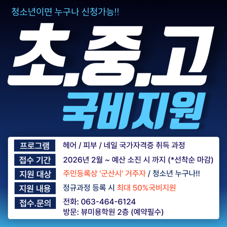 [군산미용학원] 청소년 국비지원받고 미용사 국가자격증 도전!! 안녕하세요~ #군산미용학원 뷰미용학원입니다^^ 청소년 국비지원 미용학원을 찾고 계신가요? 군산미용학원 청소년 국비지원으로 미용사 국가자격증 준비하세요. 미용에 관심 있는 청소년이라면 한 번쯤 “학원비 부담 없이 미용을 배울 수 없을까?” 라는 고민을 해봤을 거예요. 이런 고민에 대한 현실적인 해답이 바로 청소년 국비지원입니다. 군산에는 청소년도 국비지원을 받아 미용사 국가자격증을 준비할 수 있는 미용학원이 있어 교육비 부담은 줄이고, 진로는 보다 안정적으로 준비할 수 있습니다. 청소년 국비지원 미용학원, 어떤 점이 좋을까요? 군산미용학원 청소년 국비....... <img src="https://blogthumb.pstatic.net/MjAyNjAyMTJfNTQg/MDAxNzcwODc2MjEwOTQy.koDtLEopA3ufwYB4ngRSY3V2a5gcEYc29hS3XfSF_Wog.viPTqKx-N80u20E4n0Ybjz8PCpQzrOAF7Ms45n6C25Ig.PNG/%C1%A6%B8%F1%C0%BB_%C0%D4%B7%C2%C7%D8%C1%D6%BC%BC%BF%E4_-001_-_2026-02-12T140614.920.png?type=s3" />