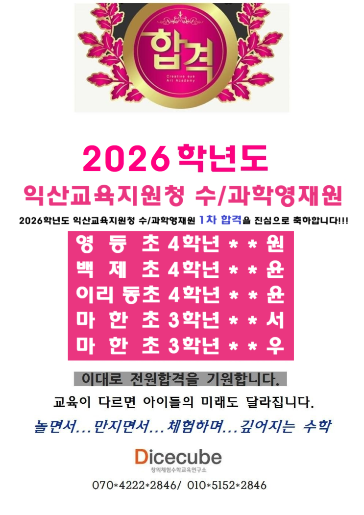 [영등동 수학학원 다이스큐브] 2026 익산교육지원청 수학/과학영재교육원 1차 합격을 축하합니다~~^^