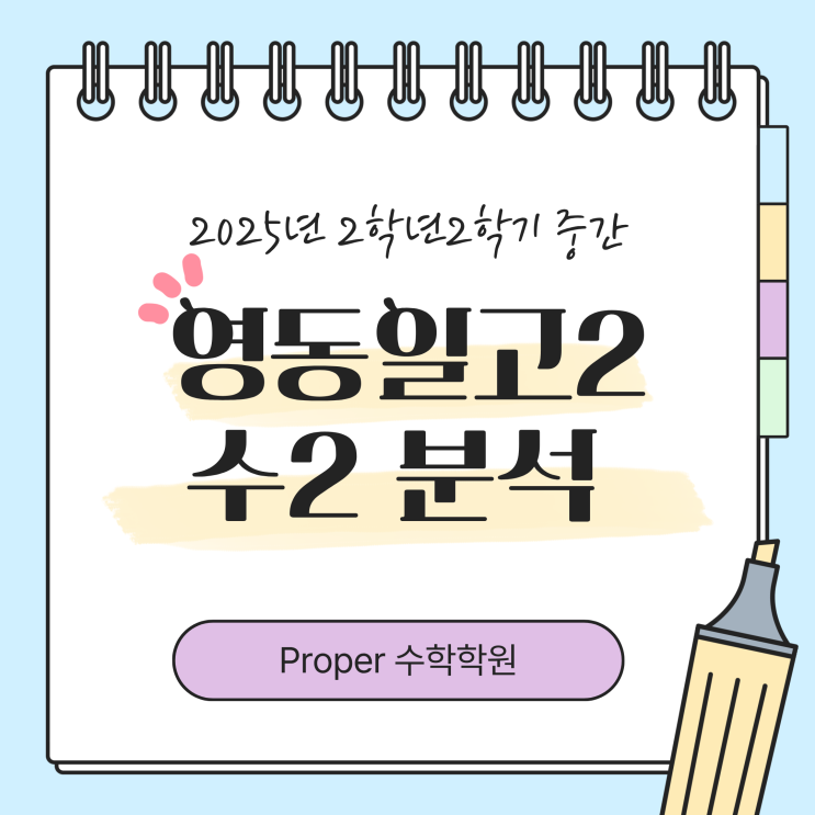 안녕하세요, Proper 수학학원입니다! 이번 2025학년도 영동일고 2학년 2학기 수학Ⅱ 중간고사가 상당히 까다롭게 출제되었는데요, 시험을 직접 분석한 결과를 공유드립니다. 앞으로의 학습 전략까지 함께 정리했으니 참고하세요! 출제 경향 분석 ✔ 시험 범위 함수의 극한 ~ 도함수의 활용(1) 기본 개념부터 응용까지 폭넓게 출제되었습니다. ✔ 문항 구성 객관식 19문항 서술형 5문항 ✔ 난이도 분포 하: 9문항 중: 10문항 상: 5문항 중간 난이도 문제가 특히 많아 시간 압박을 느낀 학생이 많았을 것으로 보입니다. 총평 이번 시험은 중 난이도 문제의 비중이 높아 ‘타임어택’이 매우 심한 시험이었습니다. 계산이 길어지는 문제들....... <img src="https://blogthumb.pstatic.net/MjAyNTEyMTBfNDMg/MDAxNzY1MzQ5MTE4MDEw._aOu0EH8oTvZ6qp_UyWGkxdC9VqdGmB9ymdGa7_trOMg.9doUZASzFsWVeOPFhDnRyE5KIYaK7KMrHSCmYul9r1og.PNG/1.png?type=s3" />