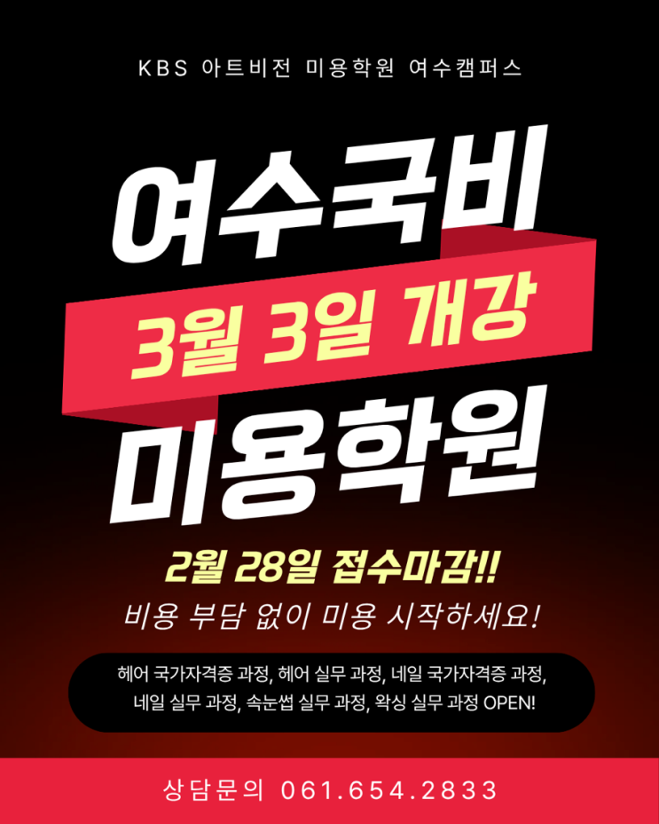 여수미용학원 여수국비미용학원 KBS아트비전미용학원 "수강료 0원 가능?! 수강료 부담 ZERO! 국비과정 오픈" 안녕하세요 미래를 디자인하는 여수 KBS아트비전 미용학원 입니다! 미용을 배우고 싶지만 수강료가 부담돼서 고민하고 계셨나요? 이제 걱정하지 마세요 ✨ 수강료 전액 ~ 70% 지원 가능! 국비 과정이 3월 3일 개강합니다. 2월 28일 접수마감!! 모집 인원 마감 전에 서둘러 주세요. ✔ 비용 부담 없이 시작하는 국비 미용 과정 “비용 부담, 걱정 없이 미용 시작하자!” 이번 국비 과정은 정부 지원을 통해 수강료 부담을 크게 줄일 수 있어 미용을 처음 시작하는 분들께 특히 좋은 기회입니다. ✔ 개설 과정 안....... <img src="https://blogthumb.pstatic.net/MjAyNjAyMjRfNjQg/MDAxNzcxOTAxMTUyOTMw.mz1eouzFG49CRHI_AxpubS20V73xCN8nbLb4cDoCR48g.jBetZ02gSUDCmZYXJzey4AQDBwAohetiBsWzHEi3f18g.PNG/IMG%A3%DF5429.png?type=s3" />