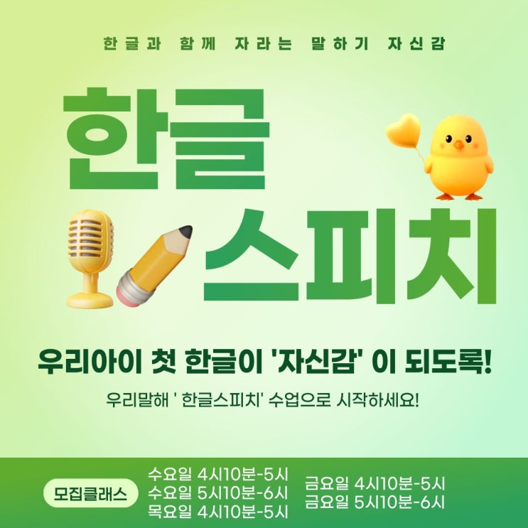 안녕하세요 유아초등 전문 말하는 교육원 '우리말해 마곡본원'입니다. 3월, 새학기가 시작됩니다. 아이들의 말과 생각도 함께 자라는 계절입니다 우리말해 유아수업은 읽고 · 생각하고 · 말하는 힘을 함께 키우는 프로그램을 운영합니다. 한글스피치반 한글을 배우는 시기는 단순히 글자를 익히는 시간이 아닙니다. 소리를 정확히 내고, 문장을 만들고, 자신의 생각을 말로 표현하는 언어 기초를 다지는 중요한 시기입니다. ✔ 한글 학습 + 말하기 훈련 통합 수업 ✔ 또박또박 발음 교정 ✔ 문장 만들기 활동 ✔ 자신감 있는 발표 연습 주 1~3회 선택 가능 (회당 50분) [모집 클래스] 수요일 4:10 / 5:10 목요일 4:10 금....... <img src="https://blogthumb.pstatic.net/MjAyNjAyMjNfMTYz/MDAxNzcxODEzNjU5ODk2.WJG1hw9bGGdr86F8YcIH33Bouur6s8IFnH-1tUd7zEkg.NdIQmlUoivphAQvK1gHYmZY_TXvyXg2AkMDrWsS3KjQg.JPEG/3.jpg?type=s3" />