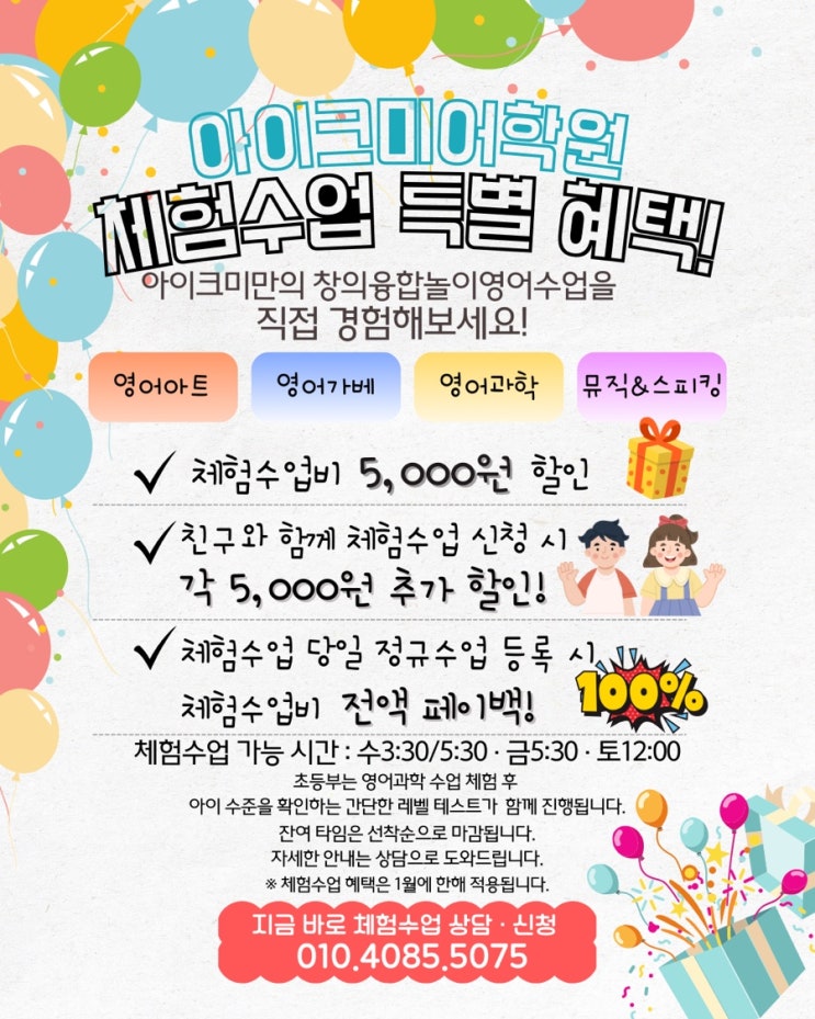 우리 아이 영어, 언제부터 어떻게 시작해야 할지 고민되시죠? 아이크미어학원에서는 영어를 '공부'가 아닌 놀이·탐구·표현으로 경함할 수 있는 창의융합놀이영어 체험수업을 진행하고 있습니다. 특히 1월 한 달 동안만 적용되는 체험수업 특별 혜택이 있어 첫 영어 수업을 고민 중이 부모님들께 좋은 기회가 될 것 같아 자세히 안내드려요. 아이크미어학원은 어떤 수업을 하나요? 아이크미에서는 유치부·초등부 아이들이 영어를 자연스럽게 받아들이고 말하고·만들고·생각하는 과정을 통해 영어에 대한 자신감을 키워가는 수업을 진행합니다. 영어아트, 영어가베, 영어과학, 뮤직&스피킹 등 단순한 워크북 수업이 아닌, 아이....... <img src="https://blogthumb.pstatic.net/MjAyNjAxMDNfMTA2/MDAxNzY3NDMyNjc4Mzgw.SW-C82TupuiD8QPh55WAbp2TwHAQetPsrp_pXtsZvbUg.0TlfhkhJbf6uo4j-w1dxxLKE4c_xIg56CAiRCbBAMGQg.JPEG/%BE%C6%C0%CC%C5%A9%B9%CC.jpg?type=s3" />