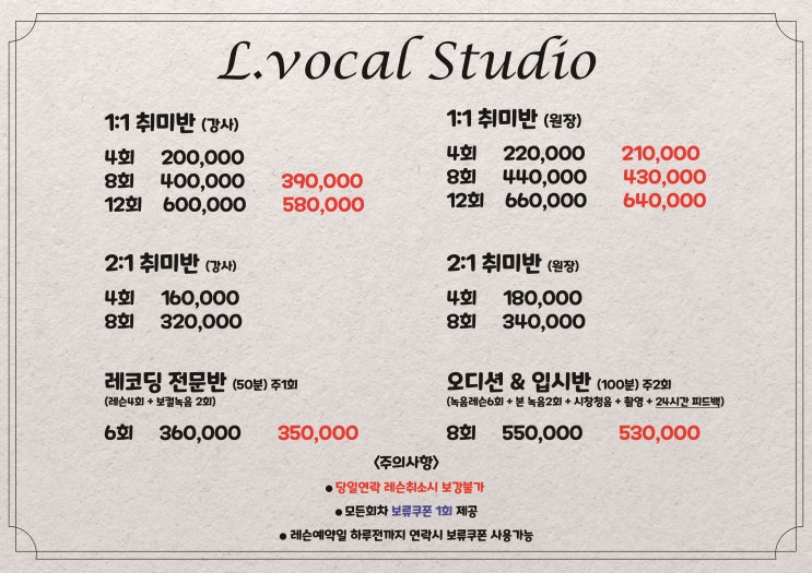 엘보컬스튜디오학원 <2026년 레슨비 운영 안내>