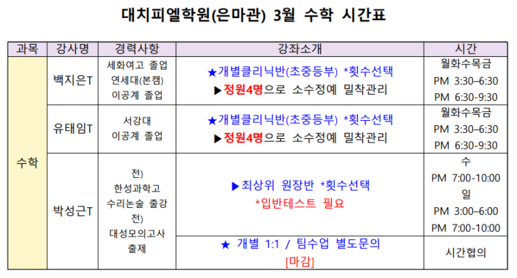 3월 은마관 수학 시간표 [대치피엘학원 은마관]