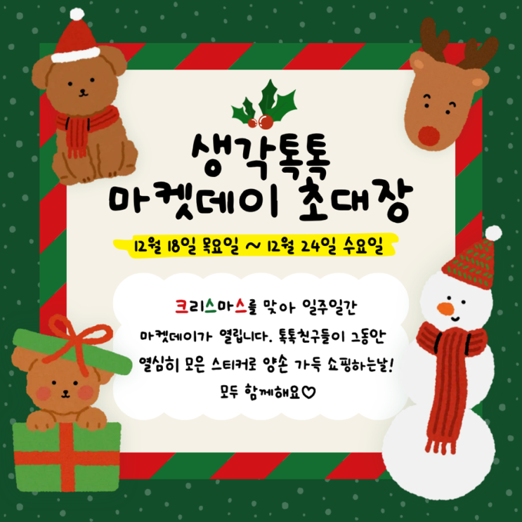 안녕하세요(ෆ ͒•∘̬• ͒)◞ 벌써 12월도 반이 지나고 올 한 해가 마무리되어가고 있어요! 톡톡이웃분들의 올해는 어떤 해였는지 궁금하네요 한 해가 갈수록 더 풍성한 결과들이 가득하고, 남은 연말도 따뜻하게 잘 마무리하시길 바랍니다! 크리스마스엔 역시 마켓데이를 빼놓을 수 없죠!! 그동안 쌓아온 톡톡친구들의 성장과 노력을 누구보다 잘 알기에 더 신경 써서 준비했답니다. 12월 18일 목요일부터 12월 24일 수요일까지 우리 톡톡 친구들 모두 신나게 즐겨보아요 <img src="https://blogthumb.pstatic.net/MjAyNTEyMTdfMTUw/MDAxNzY1OTc2NDA3MDk2.UIJBn2evTvphP4aNwtMmXKqXII8HHmQpJ0jHGQkIocAg.s0drN7Q2wZgLHvXzoN8F8AsD0fdV0W-Ivx-Fa7BCPk4g.PNG/IMG%A3%DF2287.PNG?type=s3" />