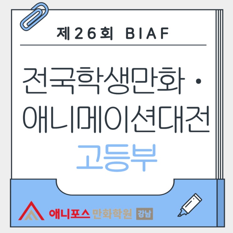 안녕하세요! 웹툰, 만화, 애니메이션 꿈이 현실이 되는 곳 만화학원 강남애니포스입니다. :) 본격적인 2026 공모전 시즌이 다가오면서 많은 학생들이 자신의 실력을 증명할 기회를 찾고 있는데요. 오늘은 그중에서도 가장 권위 있는 대회인 제26회 BIAF 전국학생만화·애니메이션대전의 핵심 정보를 만화학원 강남애니포스에서 총정리해 드립니다. 2026 공모전의 시작, BIAF 실기대전 개요 이번 2026 공모전 BIAF 대전은 미래의 아티스트들이 한자리에 모여 실력을 겨루는 장입니다. 만화학원 강남애니포스와 함께 준비한다면 이 기회를 놓칠 수 없겠죠? 대전 일시: 2026. 4. 11.(토) 10:00 ~ 13:00 (3시간) 대전 장소: 부천대학교 (경기 부천시 원....... <img src="https://blogthumb.pstatic.net/MjAyNjAzMTJfMTMw/MDAxNzczMzE1NjUwMzI0.S-DpV8o-3ibbyZ-bn4pyhWYBz8QSSIiG6r6kTXk_5Mog.jRuuZeviyYD1mUF8uPBlx6s1GjD-SBeYkAxYBmlTd2cg.JPEG/%C1%A6%B8%F1%C0%BB_%C0%D4%B7%C2%C7%D8%C1%D6%BC%BC%BF%E4_-001_%287%29.jpg?type=s3" />