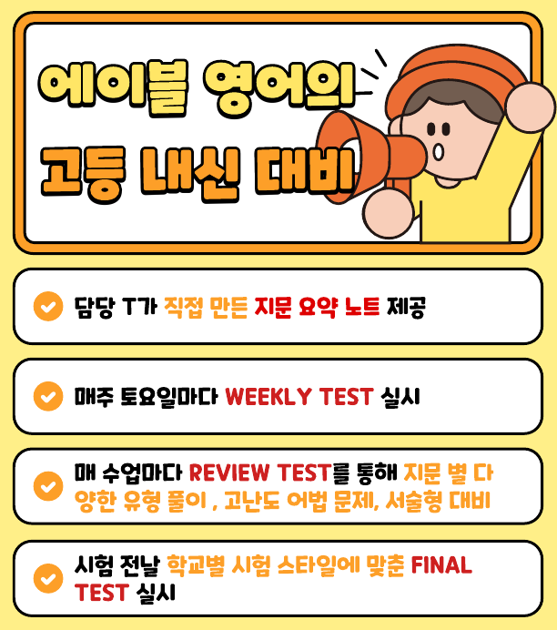 ABLE고등은 결과도 과정도 다릅니다. 1. 2025년 성적 결과 작년 고1 재원생 기준, 1등급 15% / 2등급 58% 달성! 상위권으로 가는 길, ABLE학생들이 달성하고 있습니다. 2. 매 시간 학습 리포트 "오늘 무엇을 배웠을까?" 고민하지 마세요. 매 수업 종료 후 학습 결과를 학부모님께 즉시 전송하여 철저하게 소통합니다. 3. 빈틈없는 밀착 클리닉 수업만 듣고 끝나는 공부는 진짜가 아닙니다. 부족한 부분은 수요일과 토요일 집중 클리닉을 통해 1:1로 완벽하게 보완합니다. 3월16일부터 내신대비 시작!!! 문의: 010-8970-8812 위치: 대길프라자 2층,3층 <img src="https://blogthumb.pstatic.net/MjAyNjAyMTlfMTEz/MDAxNzcxNDY5NjcyNjY3.7CuEkT6wQ5mYnqgtW96u6JYogzlAVZ20zwNn94fmVA0g.hmNimnfMtBZUNHJb3Kj0Wj5SxLHKgQ1kUDi3Cy8HVGog.PNG/image.png?type=s3" />