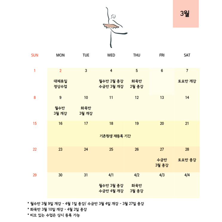 성인반 수업은 4주차 수업으로 진행됩니다. 주 1회(월 4회) / 주 2회(월 8회) / 주 3회(월 12회) 키즈·주니어 수업은 5주차 정상수업 진행됩니다. 정원제 수업으로 진행되오니 매월 3주차 재등록 기간에 미리 수강신청 해주시기 바랍니다.(선착순 마감) 보강은 해당 월 이내 주 3회 3번, 주 2회 2번, 주 1회 1번에 한하여 가능합니다.(수강권 이월 불가) 일정은 인스타그램과 학원 게시판을 통해서도 확인 가능합니다. 더 발라레필 발레학원 문의: 010-9772-6622 카카오톡: ballarepil6622 경기도 파주시 책향기로 573 월드타워3 4층 더발라레필발레학원 <img src="https://blogthumb.pstatic.net/MjAyNjAyMjNfMTM1/MDAxNzcxODMyNTc2NDgz.A4yFdgWkg7pvpTQj1Atb2rAwUO8aR_oBi4k_IR7AXDMg.oYTanKBAJZmBb479Xl6T0fX1lhwyRniMu278G9EVhXgg.PNG/3%BF%F9_%C0%CF%C1%A4.png?type=s3" />