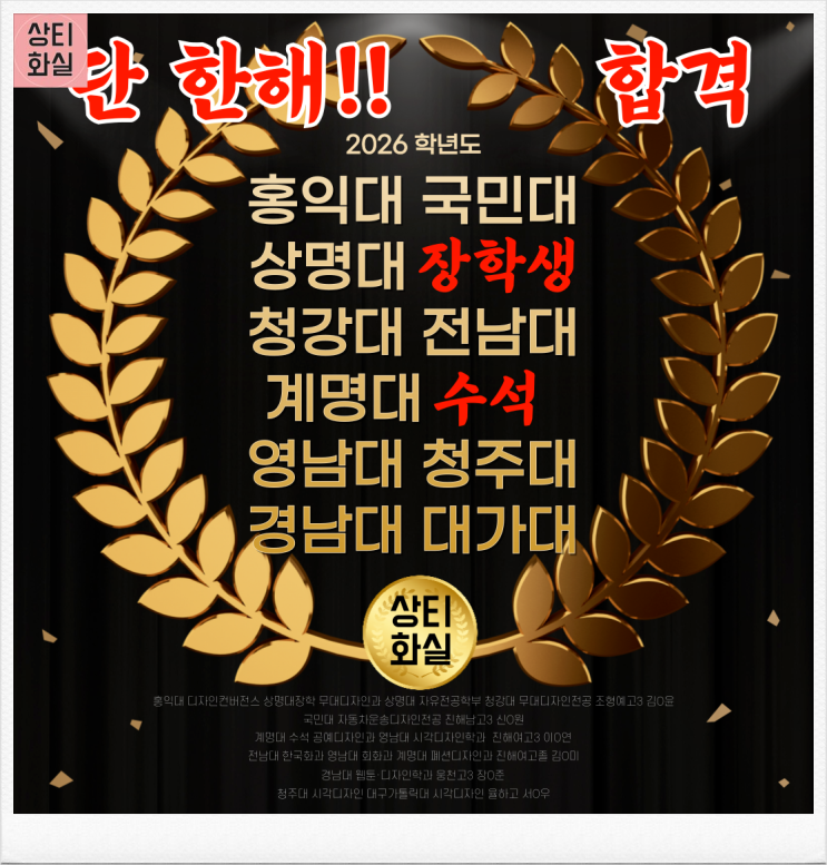 미대 입시를 준비하는 아이들과 학부모님들 하루하루 다가오는 시험과 복잡해지는 입시 전형 속에서 고민이 많으실 텐데요. "내 아이의 그림 스타일은 어떤 곳에 맞을까?" "성적과 실기의 밸런스를 어떻게 맞춰야 할까?" 이런 막막함을 느끼고 계신다면, 오늘 전해드릴 상티화실의 이야기가 그 해답이 될 수 있습니다. 미대 입시는 단순히 '그림을 잘 그리는 것'을 넘어, 개개인의 강점을 파악하고 그에 맞는 학교와 전형을 핀셋처럼 집어내는 '전략'이 필수인 시대가 되었습니다. 상티화실은 바로 이 지점에서 타 학원과 비교할 수 없는 독보적인 결과를 만들어내고 있습니다. 지금부터 상티화실이 어....... <img src="https://blogthumb.pstatic.net/MjAyNjAyMjRfMjcw/MDAxNzcxOTI0NTI0OTg0.0TvFDr72-QXPQBQPMMIqwffs2bV0pWNkhSH5Ay9Vc4Mg.wLuJEeFxEueDjBfmJd4DmZdV7q0QFJ6FcL57WLZbKakg.PNG/006.png?type=s3" />