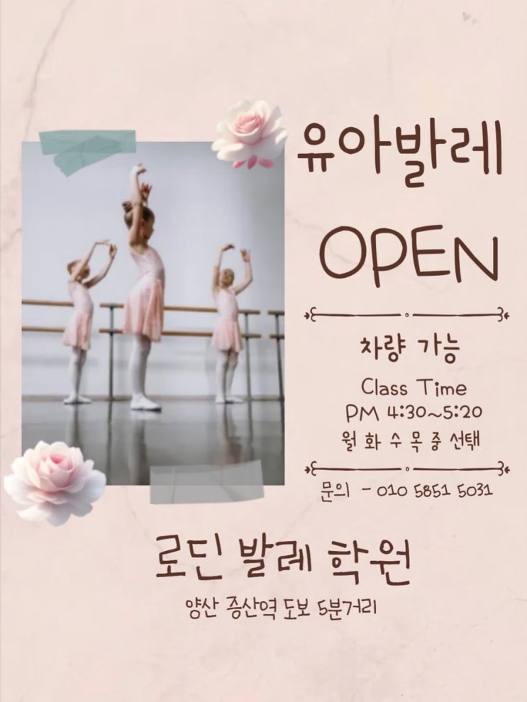 로딘발레 유아발레 클래스 OPEN 아이의 첫 발레 수업, 로딘발레 유아발레와 함께 시작해보세요. ✔ 3월 신규 오픈 ✔ 수업 시간 : 오후 4시 30분 ~ 5시 20분 ✔ 수업 요일 : 월 · 화 · 수 · 목 중 선택 로딘발레 유아발레는 ✔️ 놀이처럼 즐기며 자연스럽게 자세 교정 ✔️ 균형감각·유연성·리듬감을 키워주는 전인적 발달 수업 ✔️ 소그룹 수업으로 아이 한 명 한 명을 세심하게 지도합니다. 발레를 통해 ✨ 바른 몸 습관 ✨ 자신감과 집중력 ✨ 표현력과 예쁜 움직임을 길러주세요. 아이에게 즐거운 첫 발레 경험을 선물해드립니다 문의 및 상담은 언제든지 편하게 연락 주세요. <img src="https://blogthumb.pstatic.net/MjAyNjAyMjRfMTcx/MDAxNzcxOTA4MDA2Mzky.361eWpvBFauP4u2LKiNHU8V8dTkFyj9OODgdM7uUBrcg.xOSqr0fG4oZKNUM7UqTFxHNGHmhnL_DdvvxxEojqjw0g.JPEG/61032A15%A3%AD32E0%A3%AD4BF0%A3%ADBA77%A3%AD2FB9518B9A7A.jpg?type=s3" />